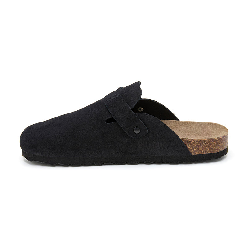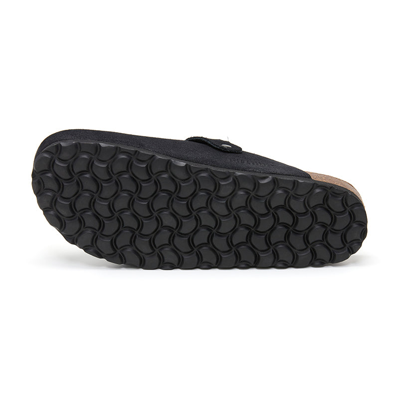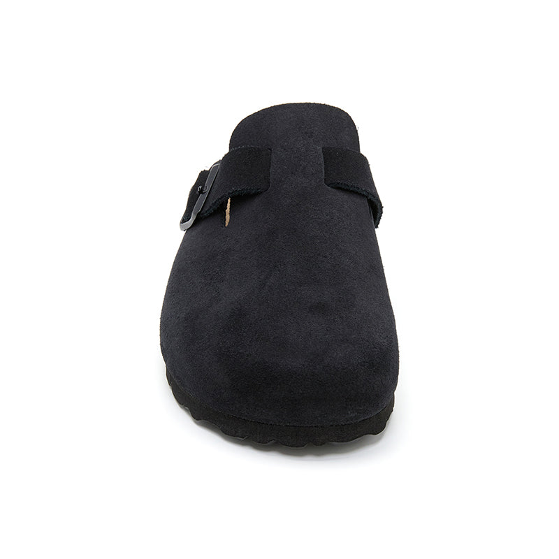 Zueco de ante vacuno con una hebilla cuadrada con ajuste.